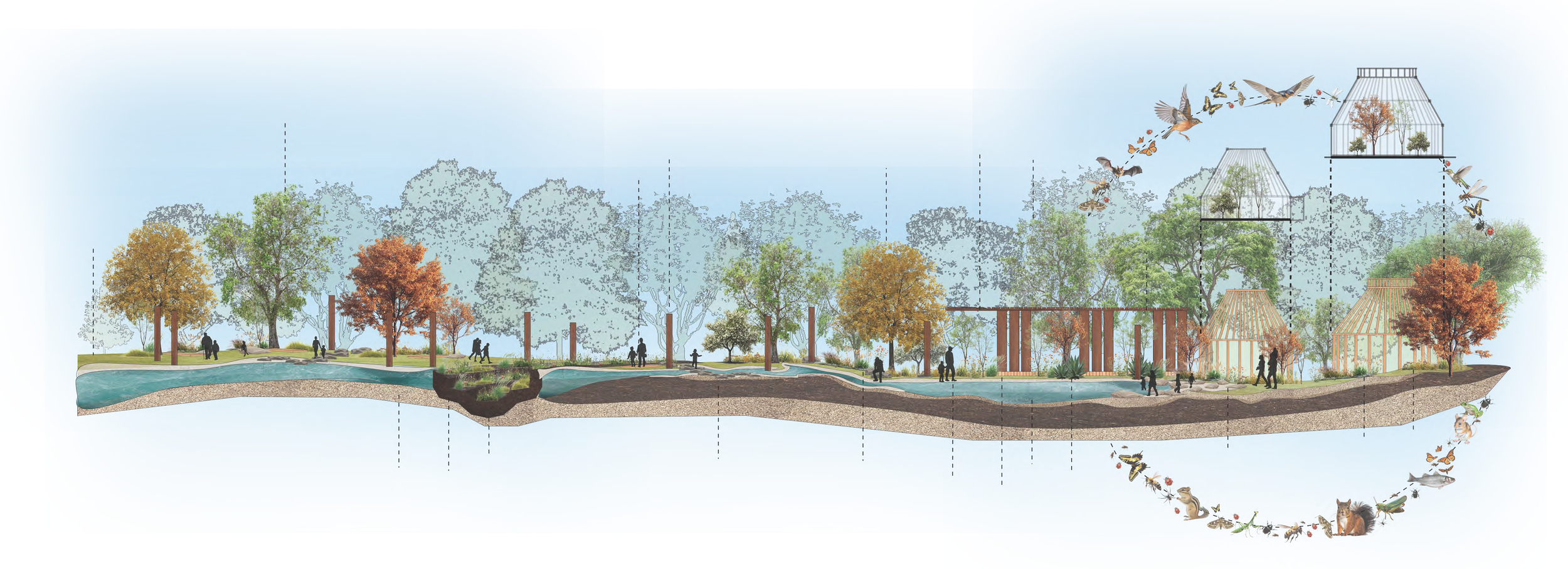 This redesign reimagines the ‘Stilted Garden’ as a restorative landscape that reconnects community, ecology, and the historic healing identity of Sycamore Mineral Springs. A sunken, multiscale bioswale becomes the spine of the site capturing, infiltrating, and filtering stormwater while supporting plant communities that nourish pollinators and wildlife. Crossing this spine is a shallow wading river fed by the mineral springs themselves, forming a sensory, interstitial waterway for grounding and seasonal learning.